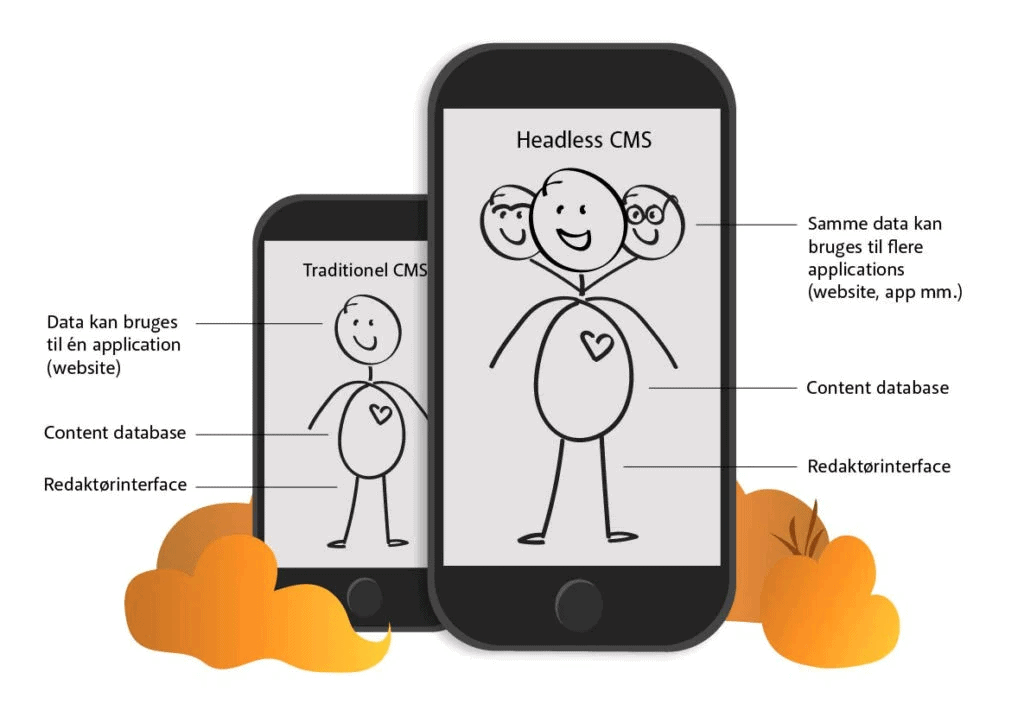 Kort fortalt betyder ‘headless CMS’, at du kan levere din indhold til flere forskellige applikationer synkront, da dit system altså ikke kun har ét ”hoved”.