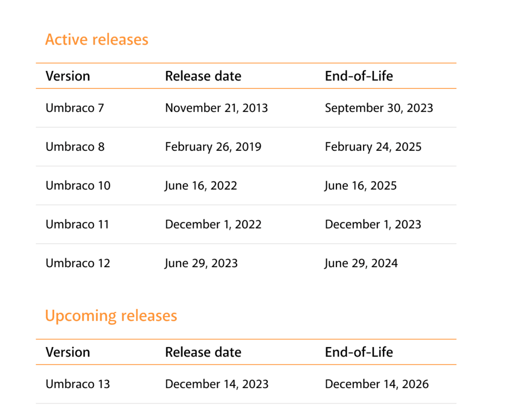 • Endelig vil Umbraco 13, som blev udgivet december 2023, have end of life blot 3 år efter (december 2026).